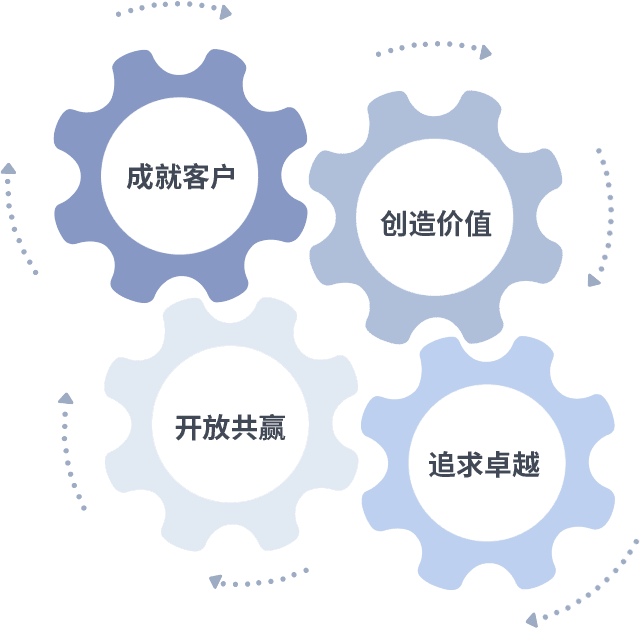 成就客户是一切决策的出发点,,,,创造价值是衡量所有工作的标准,,,追求卓越是拉斯维加斯9888做事做人的态度,,,,开放共赢是拉斯维加斯9888的格局也是最终的结果。。。。价值观的齿轮环环相扣,,推动着组织里的每个人不断向前。。